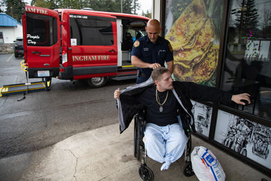Captain Steve Larsen checks a client's blood pressure in the back of the van while driving to PeaceHealth St. Joseph Medical Center on March 25. Larsen and Nick Rogers, a GRACE Intensive case manager, supported the client through medical complications over several weeks in the Bellingham Fire Department's Community Paramedic program.